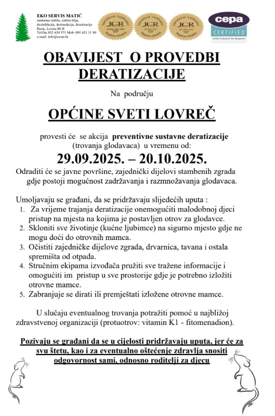 U vremenu od ponedjeljka 29.09.2025. do ponedjeljka 20.10.2025. provodit će se akcija preventivne sustavne deratizacije (trovanja glodavaca) na području Općine Sveti Lovreč.